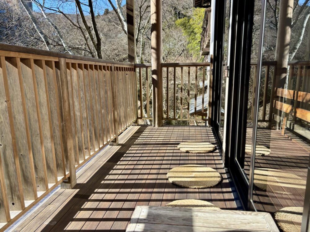 直射日光で少し日差し強いかな?と思いましたが、真冬だったのでぽかぽかと日向ぼっこな感じで、柱の影をなんとか顔に合わせながら、川の音を聞いて目の前の林を眺めること30分。笑